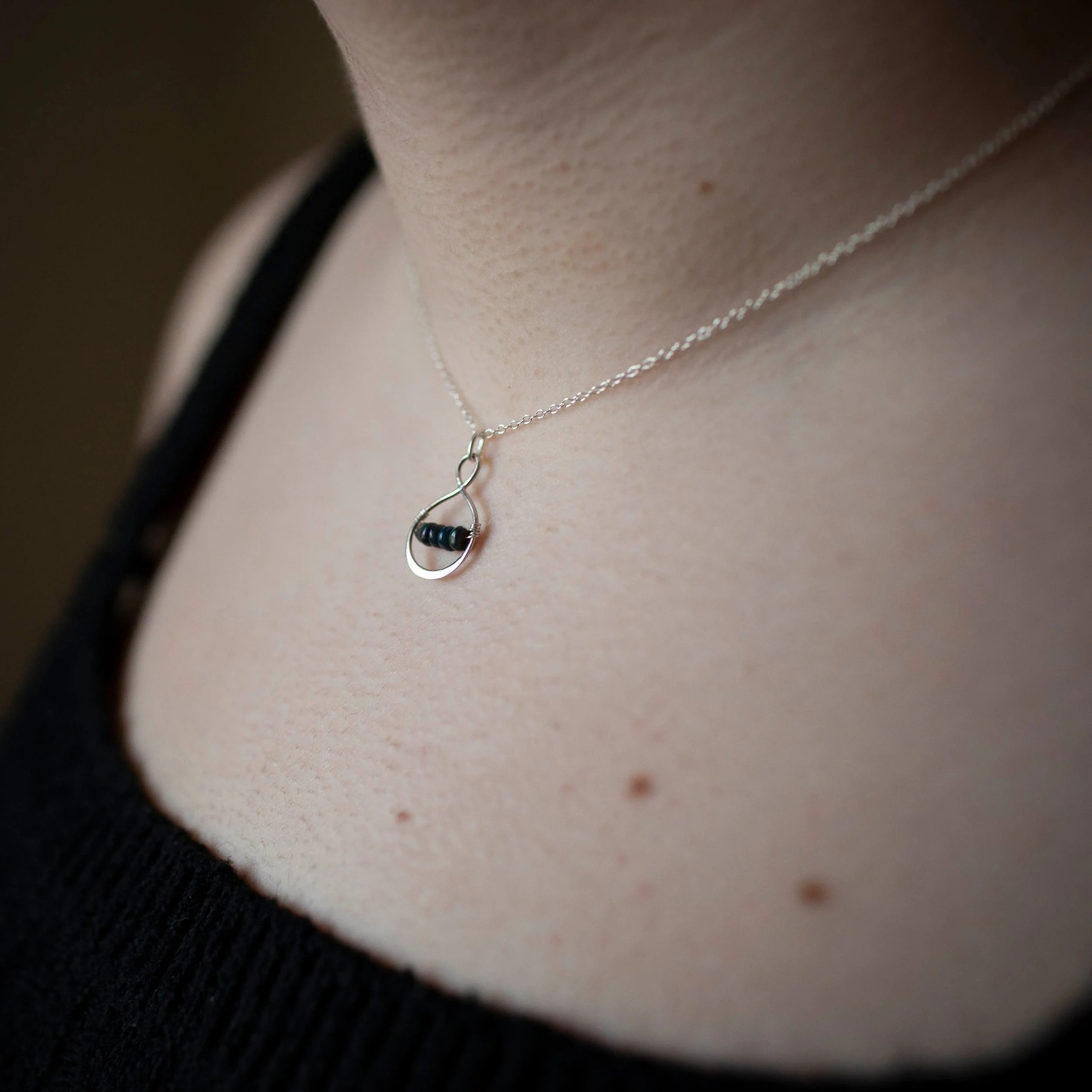 One 13x20x1mm sterling silver infinity teardrop charm with five 2-4mm Black Ethiopian welo opal beads hand wrapped on 16 inches of 1.4x1.3mm sterling silver filled cable chain with a sterling silver filled lobster claw enclosure.